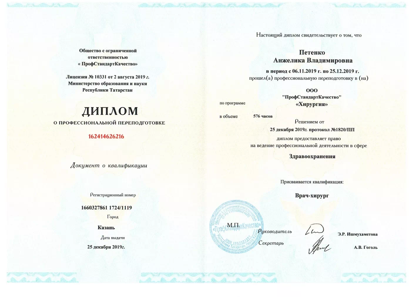 • 2019 — ПрофСтандартКачество (квалификация: врач-хирург);